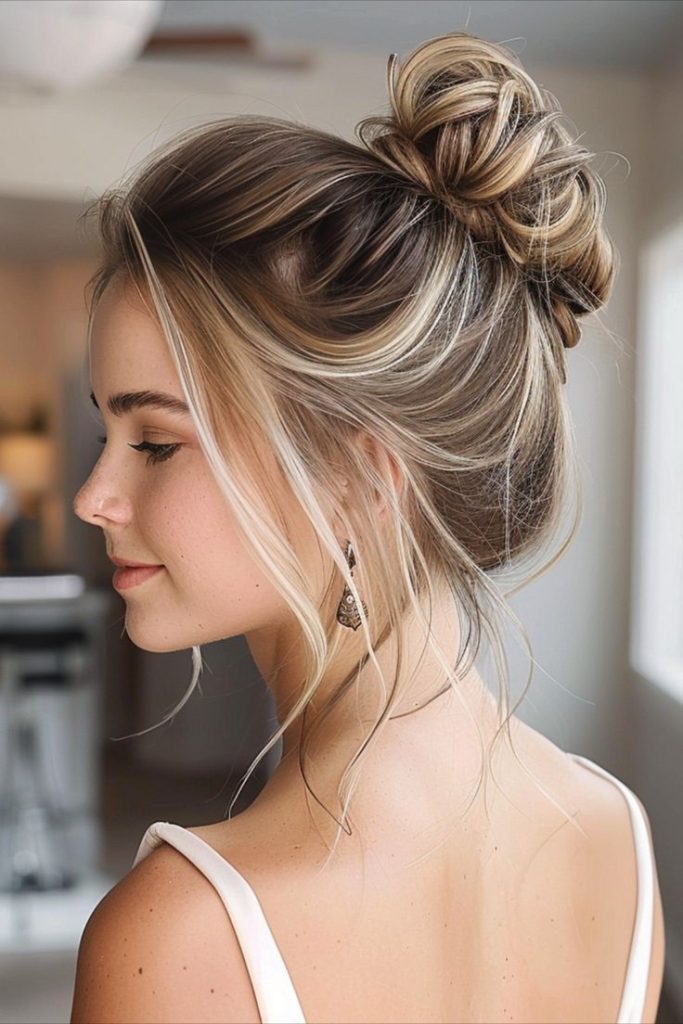 A textured high bun combines practicality with style, making it an ideal option for moms on the go. Perfect for dance recitals, beach outings, or even birthday celebrations, this updo keeps hair out of your face while maintaining an elegant appearance.