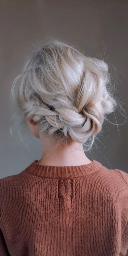 To achieve this look, gather your hair at the nape of your neck and twist it into a loose bun, allowing some strands to fall naturally. Secure with bobby pins and finish with hairspray for hold.