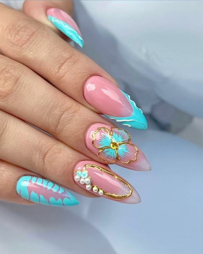 The design combines stylish design with artistic elements to make a statement. A soft pink foundation creates a base that is topped with turquoise flowing patterns and detailed gold embellishments. The design includes two nails, each with extremely elegant elements: a blue flower set in a gold frame and pearl embellishments held in place by gold wire. The almond-shaped design extends from the fingertips while adding a touch of elegance to the finger length. This nail set is perfect for summer weddings, all types of holiday celebrations and goes perfectly with light dresses and metallic decorations. A person who wants feminine accents coupled with eye-catching elements should consider this nail design as it features almond shapes that work well with either gel manicures or extensions.