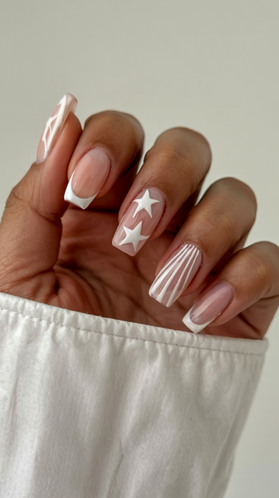 A clean, square template with a modern, patriotic styling that works for both holiday and formal occasions. The design balances contemporary elegance with vintage flair by using delicate French tips and white stripes with unique star motifs. This design maintains a classy, sophisticated appeal. The natural nail light allows the white elements to shine through the transparent background, making this design choice perfect for people who need a basic design with strong visual effects. This color palette matches both linen and monochromatic clothing and looks great on both natural nails and dip nails for basic summer hand treatments.