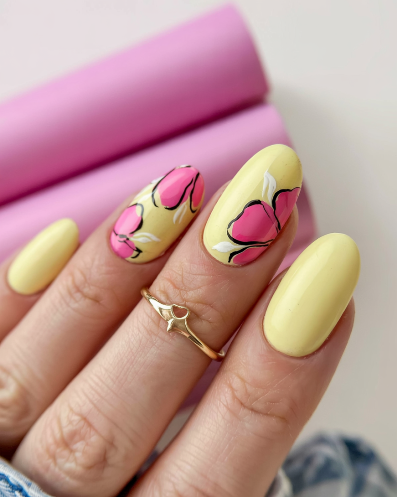 The manicure presents an enchanting summer garden vision. This almond-shaped design combines yellow French tips with hand-painted sunflowers to create a delicate floral charm. This nail art looks better without the aid of words as it tells its story on its own.