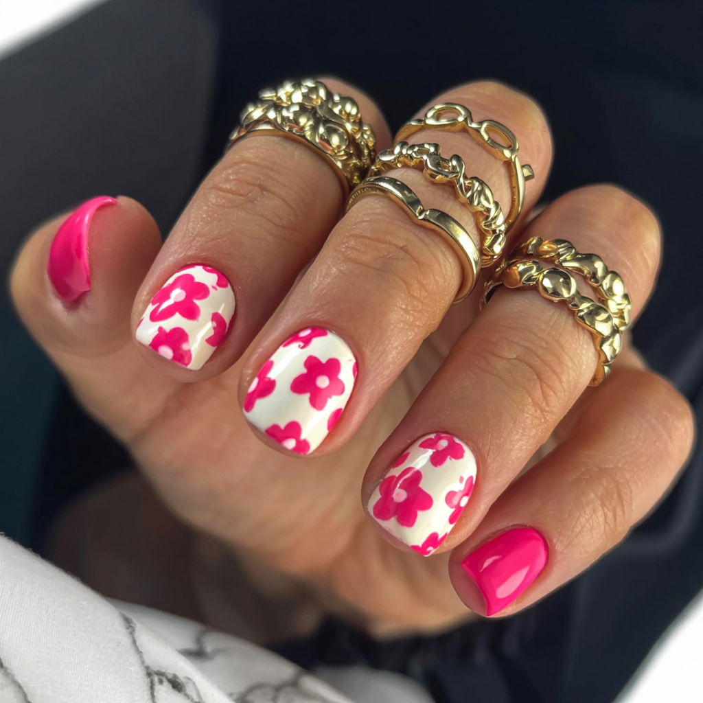 The short square nails create a powerful vintage effect with their hot pink daisy flowers resting on a creamy white background. These nails are a manageable short length that offers both functionality and a funky style touch that retro fashion cult fans will appreciate as a fantastic nail style choice. The manicure exudes youthful vibes with its fresh appeal that remains easy to accessorize. The intricate design can be achieved on natural nails as well as a short gelled look.