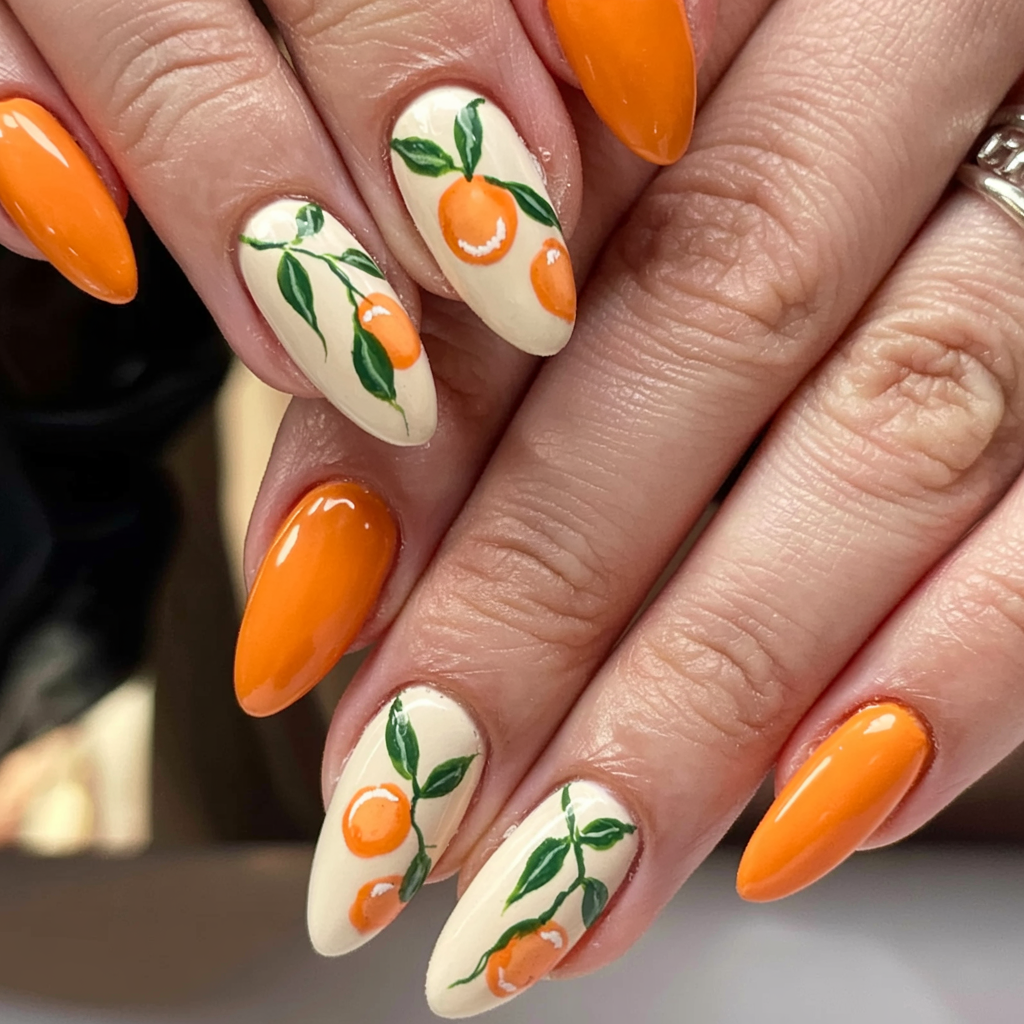 Perfect for a tropical cocktail, the bold orange manicure features fresh citrus paint for a vibrant and cheerful look. A rectangular almond nail shape draws attention to the natural shape of the fruit design, making it stand out more. The joyful, fresh vibe of this look pairs well with summer beach outfits and printed clothing. The design is suitable for both beach activities and travel occasions when you need to look glamorous.