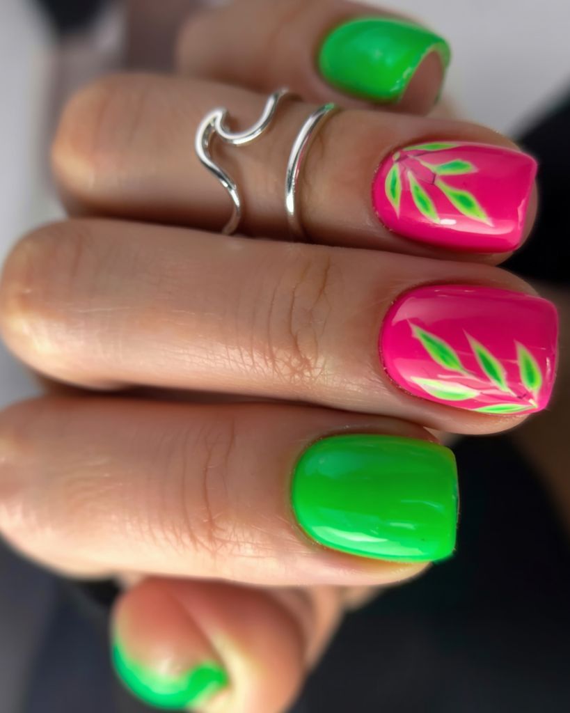 This manicure combines bright green with hot pink colors for a fruity summer party that looks like a pool party. This square manicure design with leaf accents brings a strong tropical energy because of its short dimensions. This nail design achieves a balance between intense colors by using a two-tone scheme. This perfect style works on both natural nails and dip nails to add an energetic touch to your summer collection.