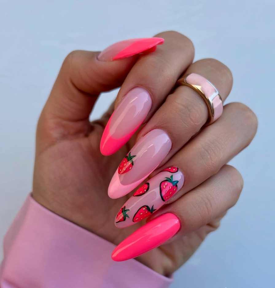 This manicure features hand-drawn strawberries over a pink glossy base that fades to neon pink at the tips. This manicure is perfect for summer brunches and vacations because its sweet tone adds tasteful elegance to any day. Complete the glamorous look with your choice of pink lip gloss.