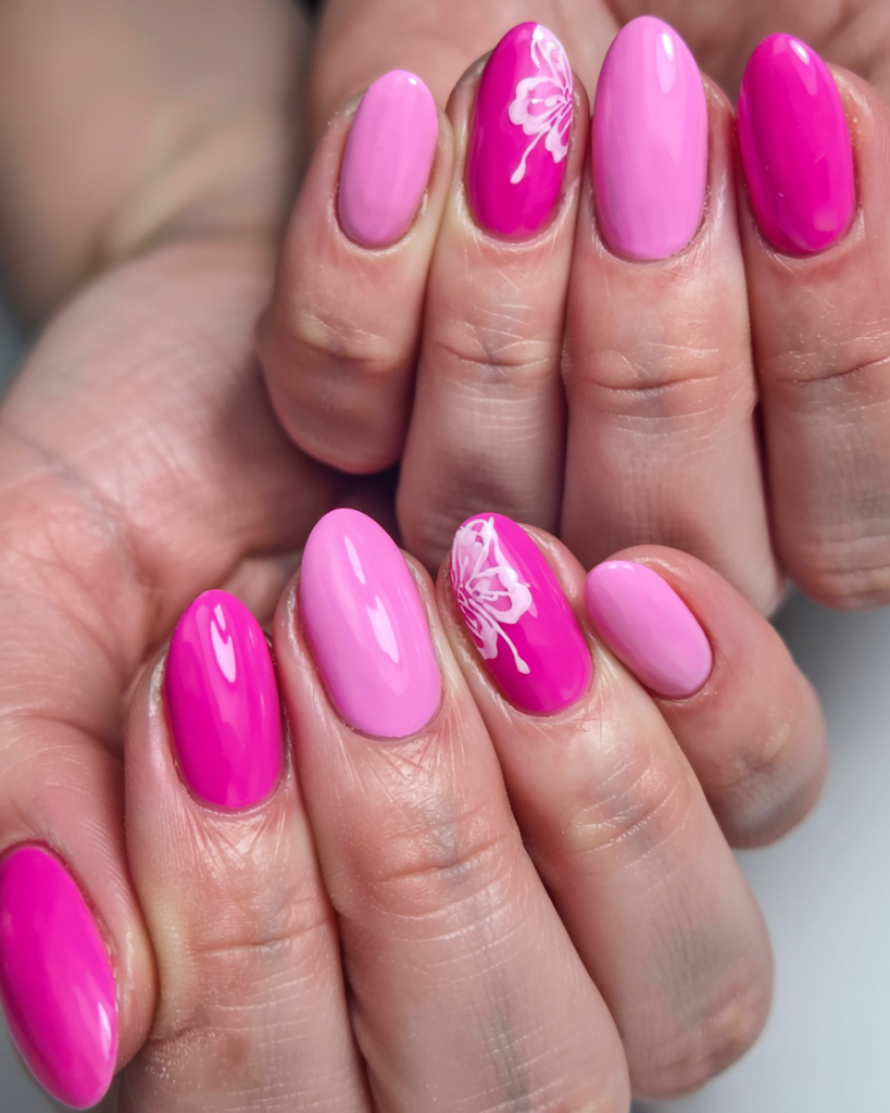 The nail set combines an oval shape while showing an intricate use of light and hot pink color variations offset by a soft white butterfly painting across two fingers. The design presents itself as a sweet and minimal creation that expresses femininity through its presence, this charming manicure works perfectly at baby showers or garden events, but also serves all those who want elegant and peaceful designs with simple aesthetics.
