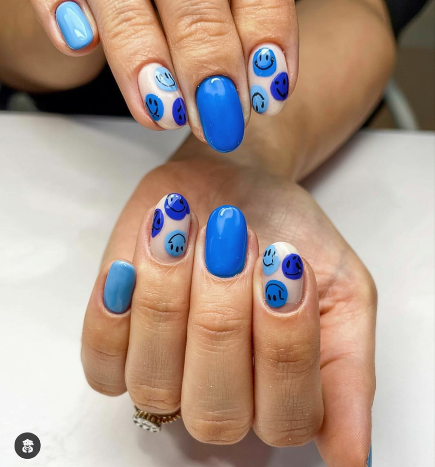 This manicure is perfect for people who have positive vibes in their mood throughout the summer season. Yellow smiley face features emerge from a blue color palette with both light and dark tones. The rounded nail shape used in this design creates a youthful and carefree look.