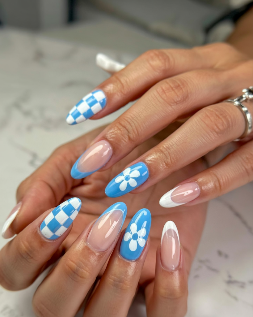 This design teaches the perfect harmony of contrasting elements. A combination of plaid patterns and daisy accents exist with soft French tips in blue and white. The almond shaped nails maintain class and elegance as they combine different designs along with pattern combinations to deliver a unique fresh style. The manicure design combines sophisticated elegance with funky aesthetics, just like those who combine fashion trends enjoy their manicure. The easy combination includes styling it with denim outfits or white flowing dresses to achieve total perfection.