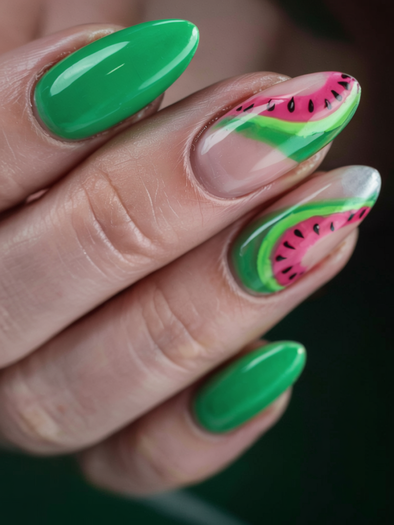 This design offers authentic summer charm with its lifelike watermelon presentation for hand decorating that includes realistic watermelon elements. The almond design is perfect for classifying decorated fruit slices that accurately depict their colorful green exterior with a white belt and pink interior dotted with tiny seeds. You can achieve equal measures of boldness and playfulness with this manicure, which combines fully coated green nails and serves as a refreshing beachy addition to any ensemble with a crisp fruity appeal that no one can refuse. The nail design is built on gel nails for season-long durability.