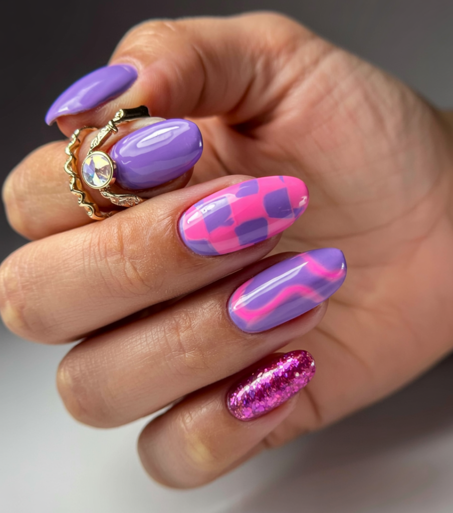 The matching combination of lavender with hot pink and glitter nails creates a totally funky yet confident look. The creative checkerboard design along with swirling stripes on this nail combination stands out, yet its oval shape gives it an everyday quality for day and night looks. Such a design pairs best with monochromatic outfits or complete Y2K themes with glitter accents. You can rock these nails whether you need them for a brunch look or a bar night, because they stand out on their own.