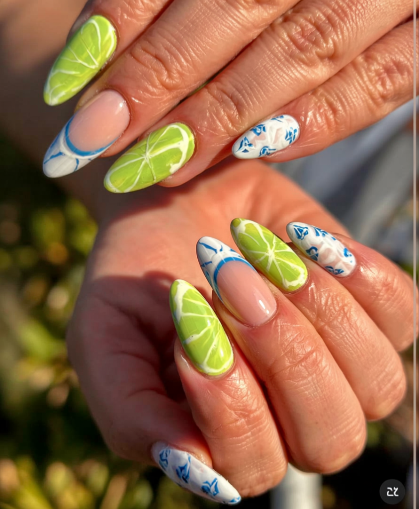 These almond-shaped nails have a fresh, vibrant look with lime-colored artwork that creates a zesty atmosphere. The lemon slice colors join translucent nails under white tile patterns and blue floral motifs. Sipping a mojito in a Mediterranean courtyard creates that carefree summer feeling that matches the design. This simple nail design adds a touch of elegance to a casual ensemble without going overboard. This nail design is suitable for people with natural and gel nails, offering both artistic appeal and elegant timelessness.