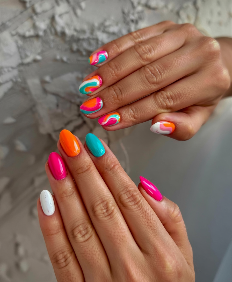 Consider this the retro remix your nails need. This well-designed round manicure combines turquoise with pink and orange swirl colors for funky style in a harmonious arrangement. The swirl patterns on one side use solid and alternating color combinations, and the round nails are equally at home on the beach or at a sunset happy hour. The design is approachable and youthful, but will suit anyone who enjoys colorful designs.