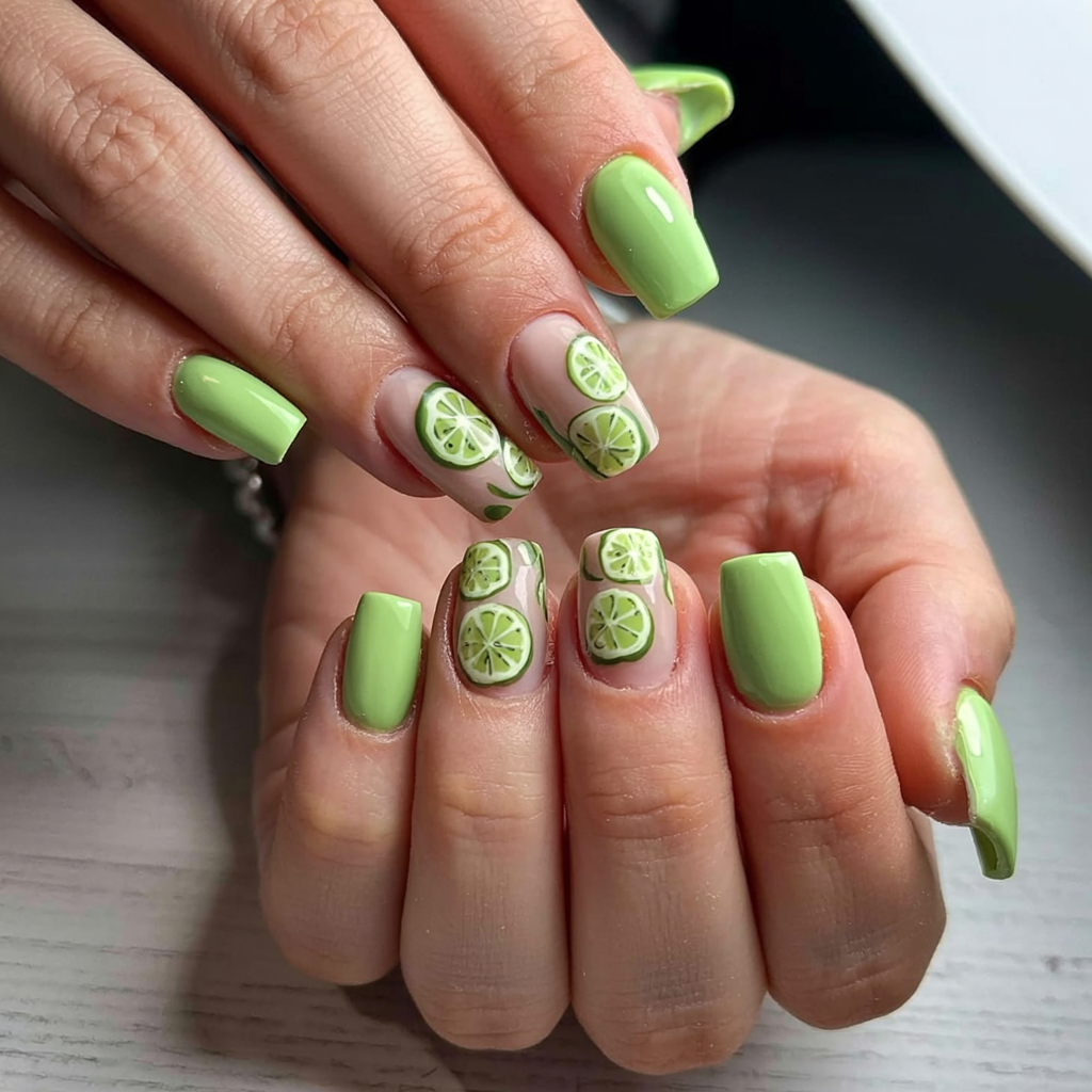 The Square Manicure is a fresh citrus design for those who love clean lines. The manicure features green lime slices against a neutral background with solid green nail tips for a balanced look. It’s whimsical yet polished.