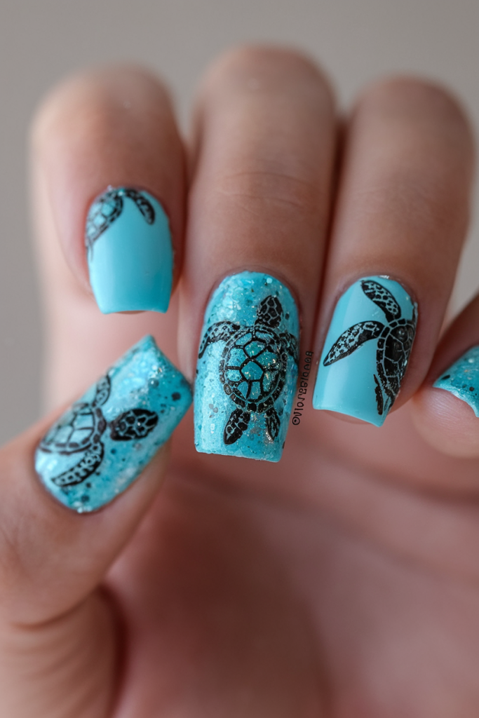 This square nail shape look blends soft turquoise gradients with black sea turtle art, invoking a peaceful, underwater aesthetic. The texture is enhanced with flecks of glitter that catch the light like sunshine on waves. It’s perfect for those seeking a simple yet meaningful design that honors marine life while staying fashionable. These gel nails are a nod to natural nails, with just enough shine to make them pop without overpowering the charm.