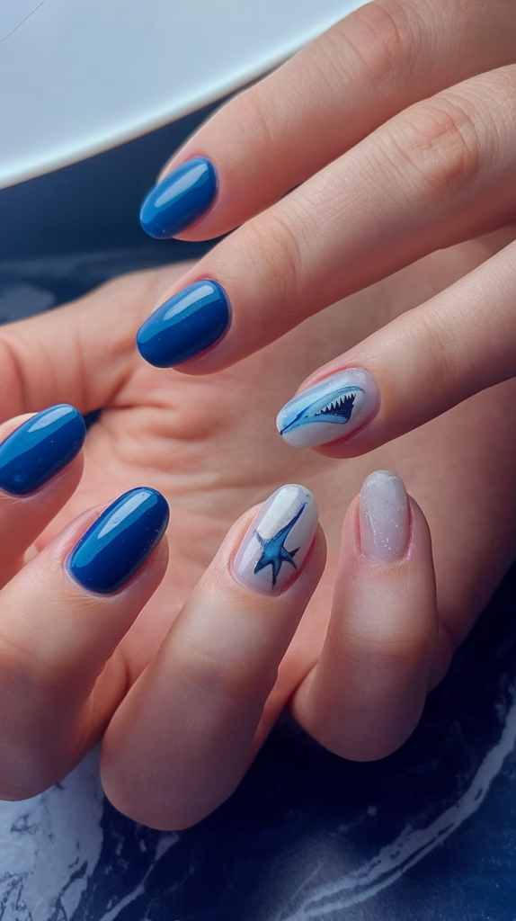 This short, rounded gel nails look captures the drama of the deep sea with its combination of intense blue polish and marine motifs. A sleek shark silhouette and a starfish add a touch of art sea storytelling, balancing edge with cute appeal. This style is ideal for those wanting a modern marine twist without going overboard.