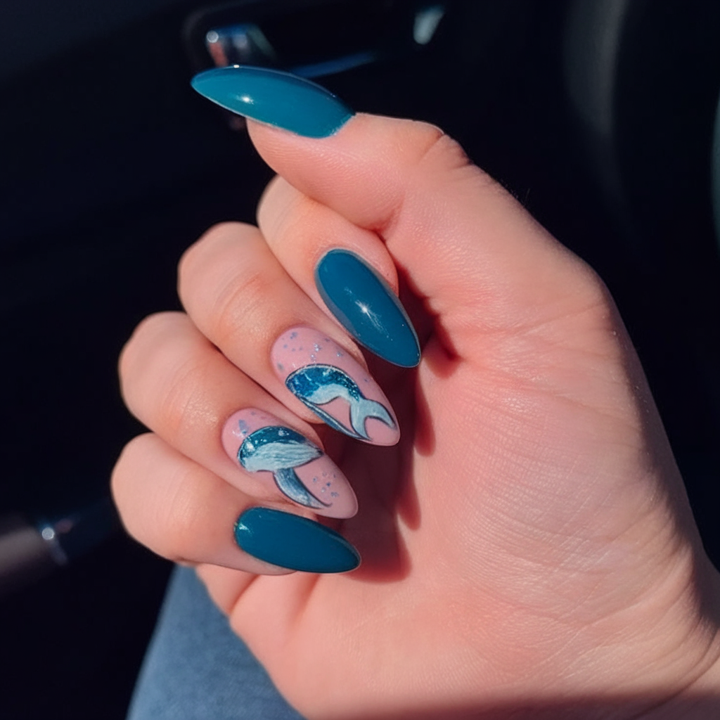 A love letter to the ocean’s gentle giants, this almond-shaped nail type features detailed whale tail art surrounded by ocean-blue polish and glitter bubbles. The effect is chic, tranquil, and undeniably summer. It’s a whimsical yet elevated choice that suits sunset dinners by the coast or a casual seaside brunch.