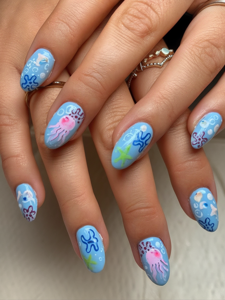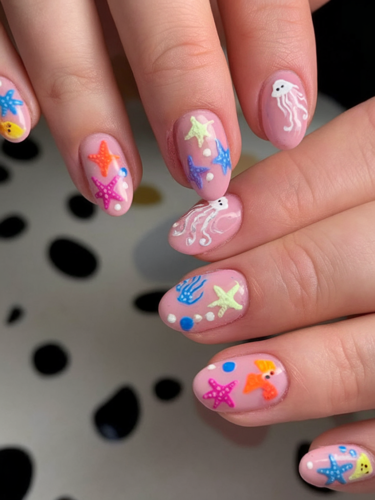 For the bold and the playful, this manicure is a colorful tribute to undersea life. Featuring jellyfish, starfish, and dots on a pink base, it brings a youthful glow to the short nail shape. Ideal for casual outings and pool parties, it’s a lighthearted option that proves cute can still be stylish. The slightly raised 3D finish adds tactile dimension without going overboard.
