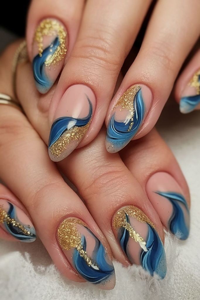 Channel the opulence of a beach sunset with this matte and glitter mix. Swirling blue waves collide with sandy golds on a soft pink base, forming an abstract yet earthy aesthetic. The natural nails vibe remains intact thanks to the gentle curve of the oval nail shape, making this a polished yet grounded choice.