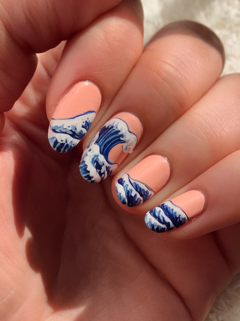 With painterly waves crashing over a peachy backdrop, this art piece is clearly inspired by classic Japanese woodblock prints. Ideal for lovers of refined detail, this manicure celebrates the dramatic force of water while staying wearable. It feels like carrying a pocket-sized canvas of the sea—elegant, edgy, and culturally rich.