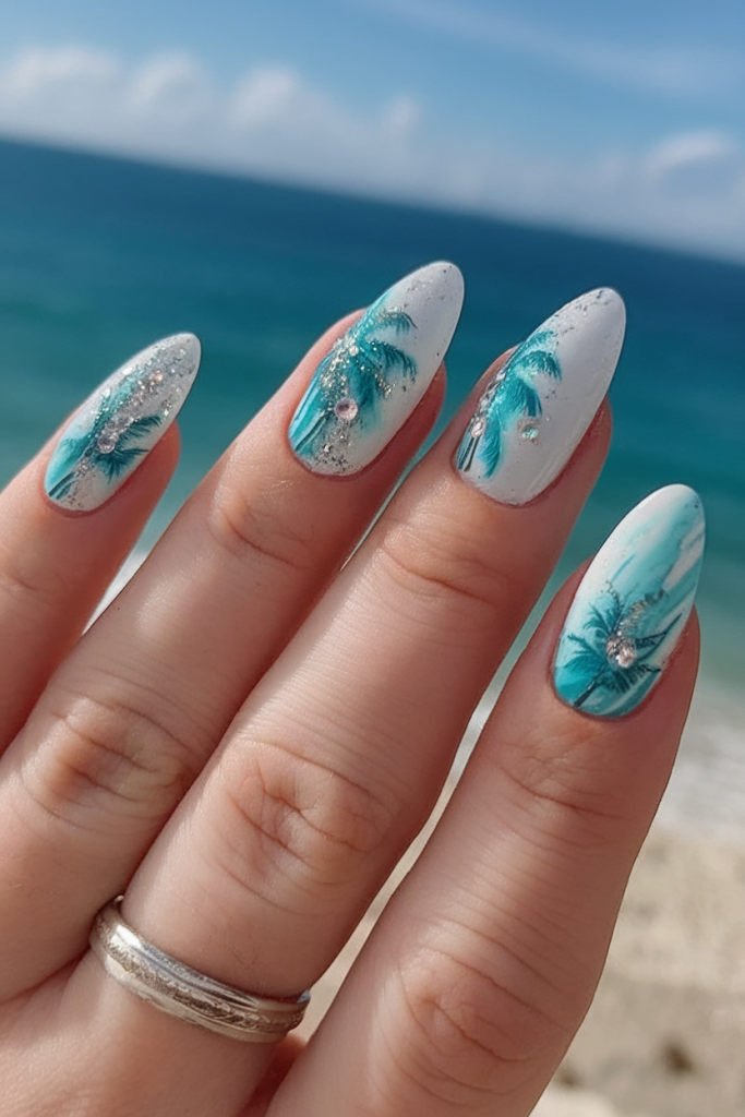 Take a mini vacation every time you glance at your hands. These gel nails show off tiny palm trees with glittery skies and a touch of bling that catches the light just like sun on water. The elongated almond nail shape enhances the beachy drama while remaining playful.