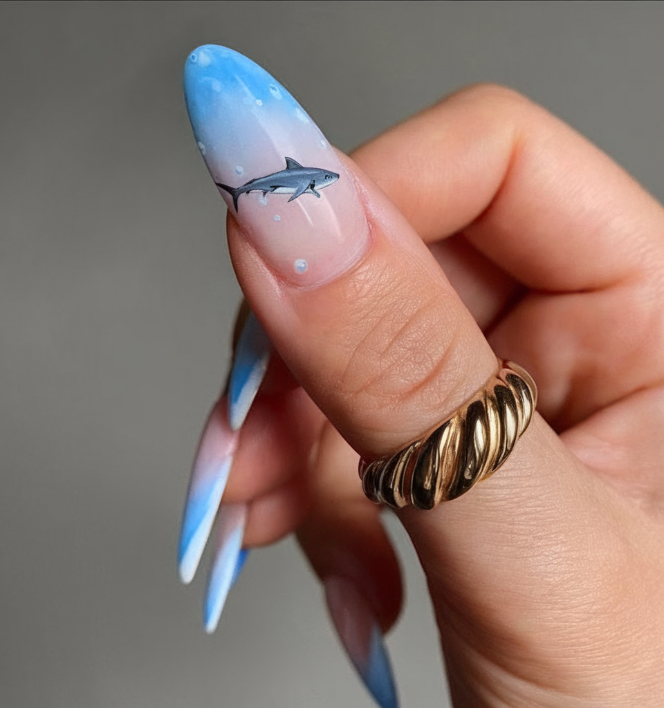 Bold and cinematic, this stiletto manicure captures the thrill of open waters with its ocean-blue gradient and a sleek, solitary shark. The style walks the line between cute and fierce, making it ideal for fashionistas who like a little mystery in their summer look. Think world styles with an edge.