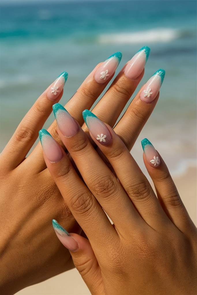 These gel nails give off breezy island vibes with a turquoise French tip gradient that fades softly into a sheer pink base. The almond shape elongates the fingers, while delicate 3D white floral accents elevate the look to something truly special. This design is as serene as a beachside morning, combining cute minimalism with resort-ready glamour.