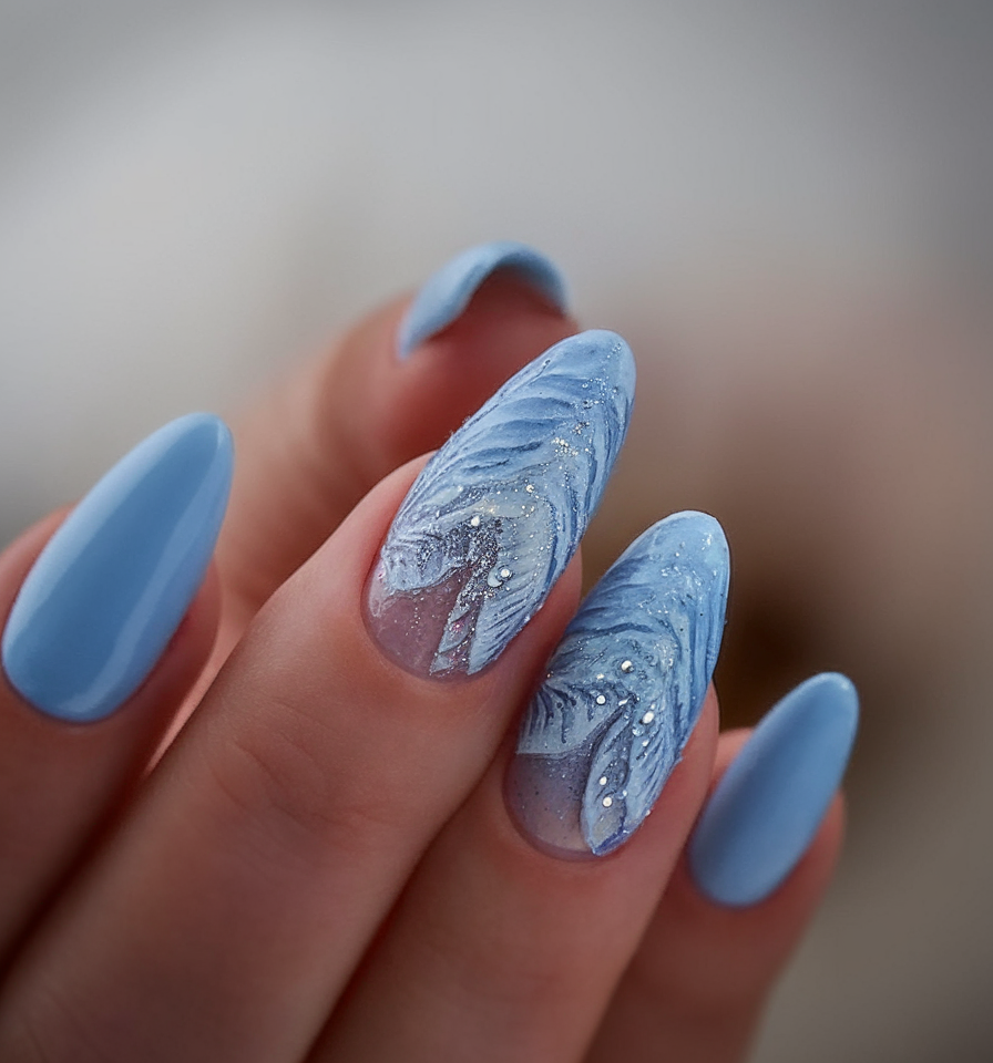 Inspired by the ripples of soft tidewaters, this acrylic nail set uses a delicate blue palette with sculpted texture and a hint of glitter. The feathered patterns mimic foamy waves washing across the shore, bringing a peaceful and refined aesthetic to your fingertips. Perfect for brunch by the sea or an evening sail, this oval nail shape style balances elegance with coastal whimsy.