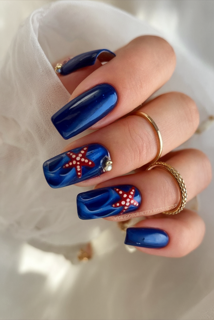 These square acrylic nails are drenched in deep blue polish with metallic sheen, accented by red starfish bling and subtle wave patterns. It’s a luxe take on the ocean trend, perfect for an upscale beach event or evening soirée. The high shine finish and glitter elements give it that wow factor—dramatic yet still rooted in nature.