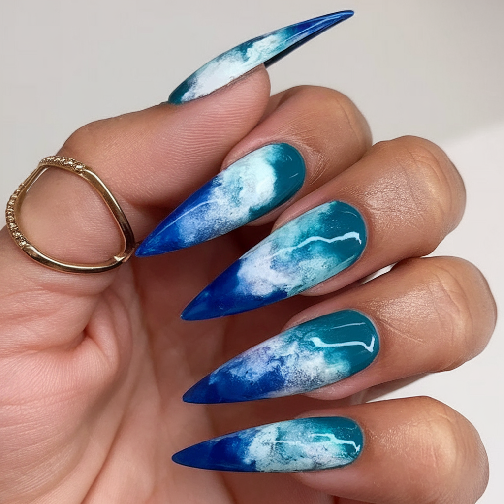 These dramatic stiletto nails deliver full-on sea summer intensity with crashing wave visuals in rich blue and teal tones. This nail type screams confidence and creativity—perfect for someone who isn’t afraid to stand out. Each tip is like a miniature painting, offering wearable art that’s editorial-worthy.