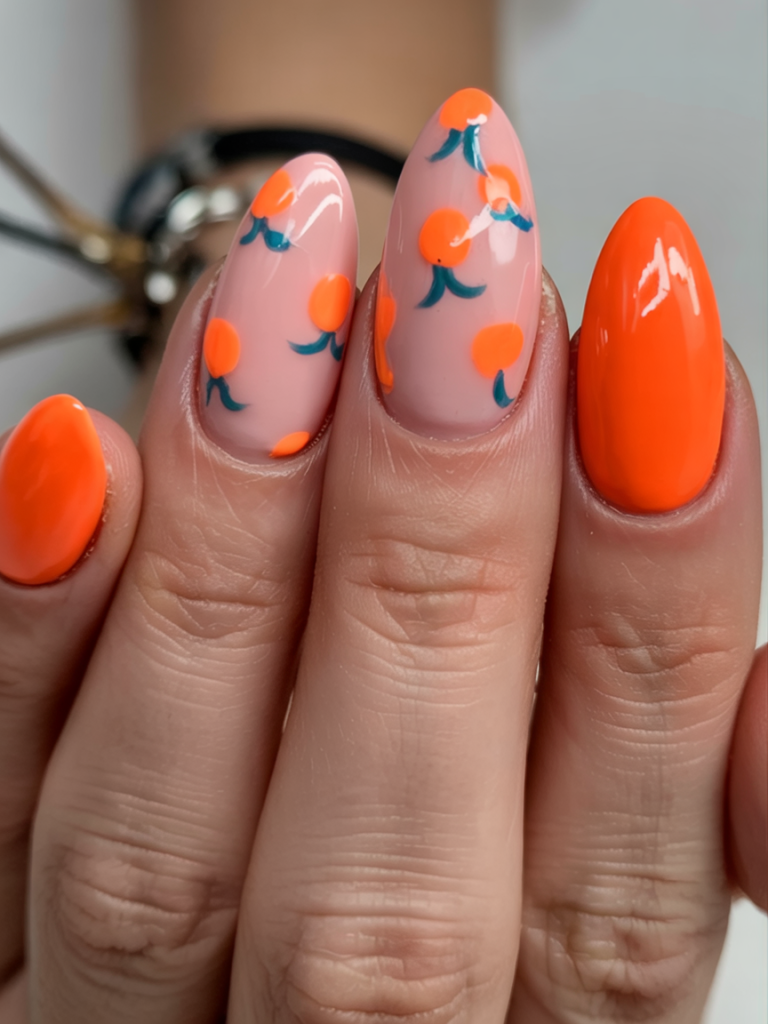 A vibrant array of fresh mini-fruits spreads across a pastel pink background, making this orange set both exciting and edible. This look achieves a fun and funky feel through its tiny citrus rounds along with green leaf details. Various almond-shaped elements provide both volume in the silhouette and space to showcase the fruity composition. The cute little fingers in this collection make it one of the best 2025 concepts to try.