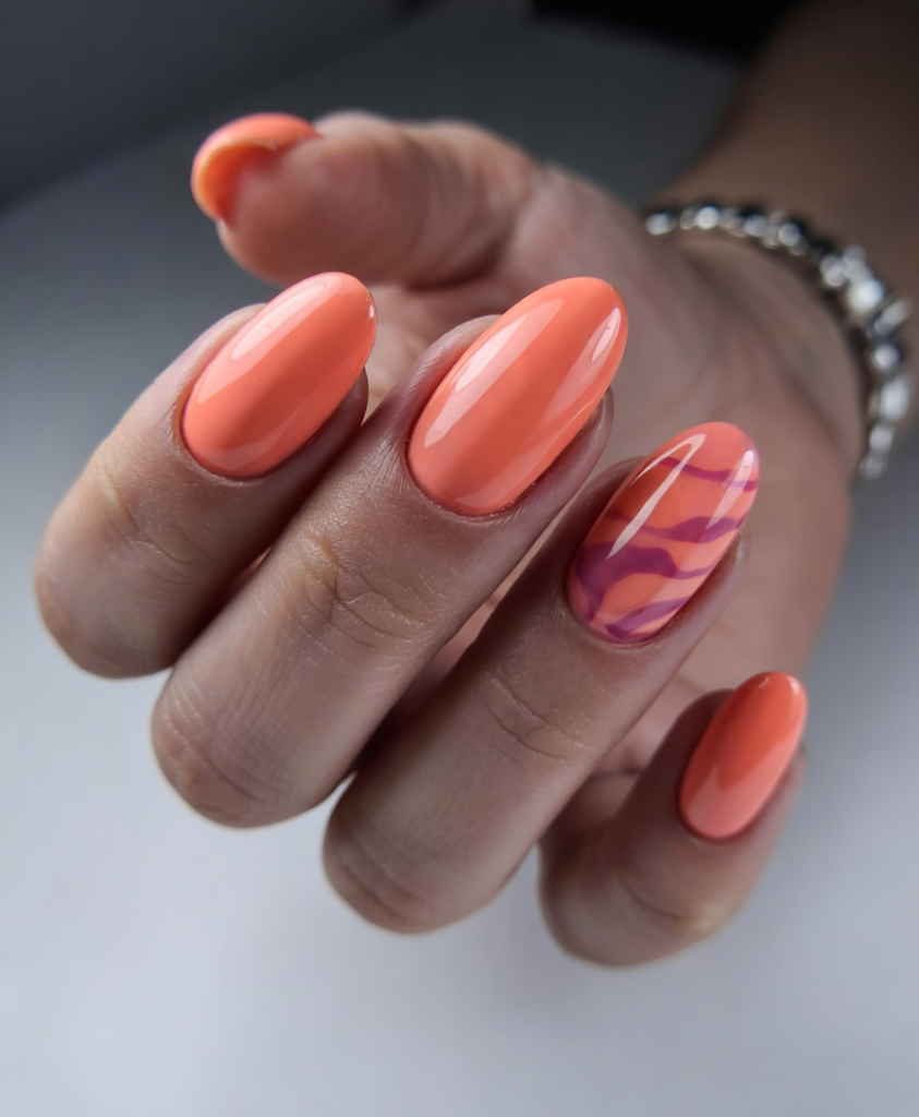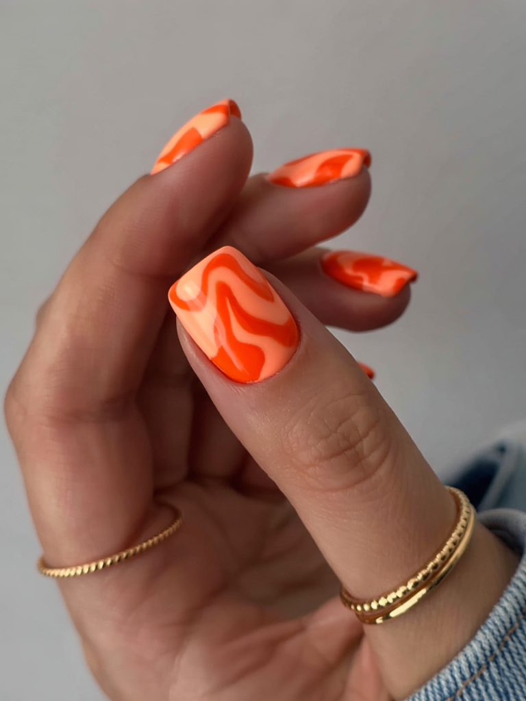 Take a look at these lava lamp style swirls that will put you in a creative trance. Neon orange color combines with peachy curves to create a visual effect of energy in motion. These short nails are a fantastic choice for people who want their beauty to be abstract, but need structured shapes to maintain balance. This design delivers a summer personification and an exciting transformation that is perfect for summer vibes.