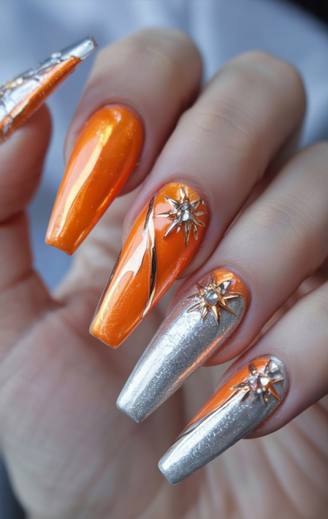 People who love a gold-plated aesthetic will find absolute delight in this spectacular, highly reflective coffin style frame. A mix of metallic silver and reflective orange, it features additional embellishments that combine stars with crystal centers. The style component seems both futuristic and divine goddess, and this combination creates an experience that will be unforgettable. These nails send a powerful message for the year 2025 as they combine the elements of sparkle and artistic principles with galactic charm.