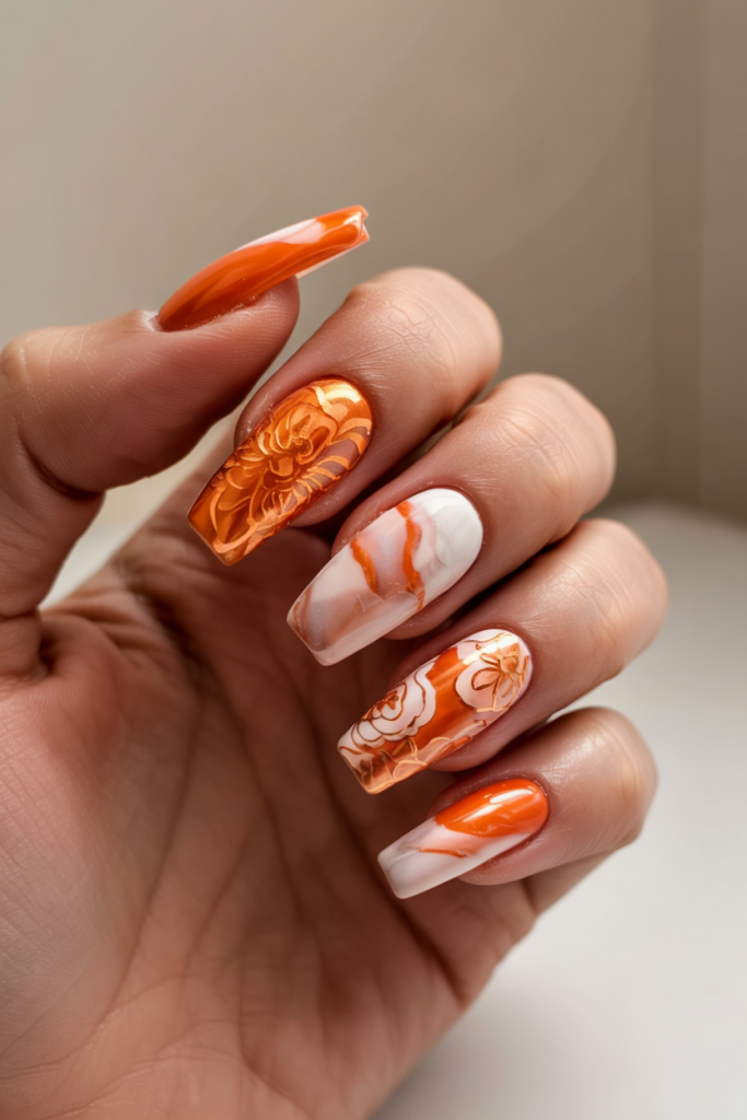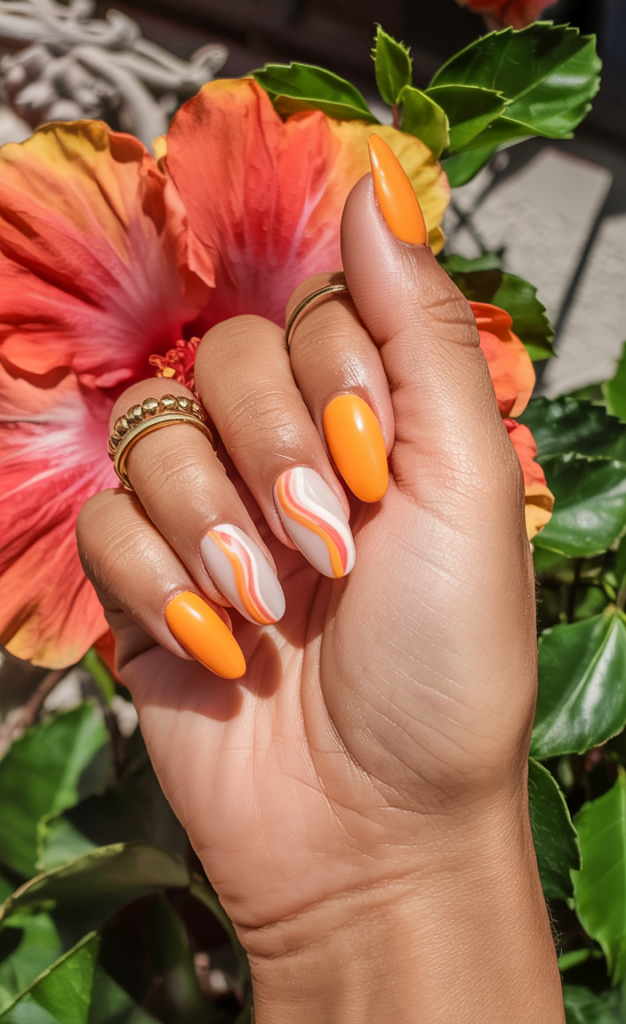 The tropical theme of these two nails combines bold neon orange with sophisticated marbled patterns. The nails within this design have been prepared differently between two solid, obstructive styles and two alternative designs that showcase wavy, painterly lines in peach and orange shades. The oval nail design brings natural charm to a look that otherwise feels electric and electrifying. There is a combination of futuristic 2025 trends and vintage yet minimalist beauty elements in this set.