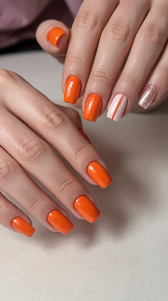 A short acrylic set combines sophisticated glamour with a striking composition. A single dominant nail differs from the standard orange finish by featuring a modern white base with an orange vertical stripe. The final nail incorporates glitter accents that stylishly combine shiny elements with flat finishes. These nails serve as a bold fashion statement that allows the contemporary woman to combine architectural elements with dynamic versatility.