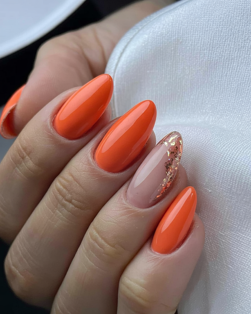 Elegance gets a twist in this exquisite nail design. A vibrant orange dominates most of the nails to create a strong visual statement, while a half-stained nail acts as an accent feature with nude tones enhanced by copper and coral glitter. The polished combination achieves a complex yet fashionable approach that enriches almond-shaped nails with just the right amount of bling. This style looks fantastic for daytime and evening events as it works with neutrals and summer whites. A perfect 2025 style represents elegance with contemporary appeal.