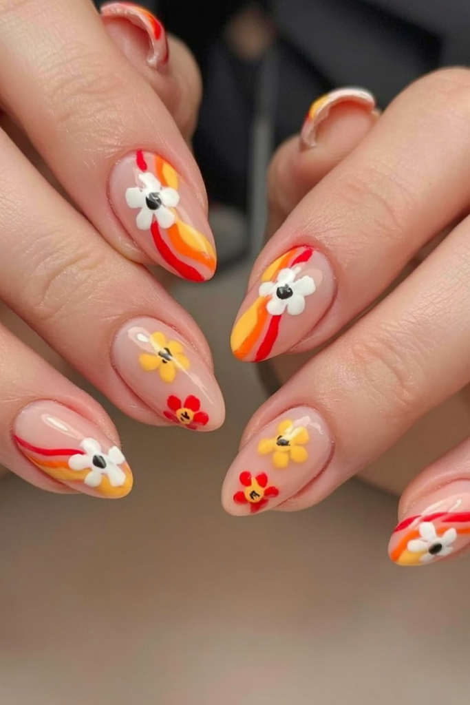 The ’70s flavor comes through with psychedelic shapes and whimsical floral patterns for a retro vintage aesthetic. Each finger looks exceptional with almond-shaped nails that flatter all finger lengths as the designs transition smoothly between oranges, yellows and reds. The flowers in this set combine assertiveness with sweetness, making it perfect for music festivals and summer travel. The retro feel of this design is evident in its movement and mood, but remains modern with a contemporary touch.