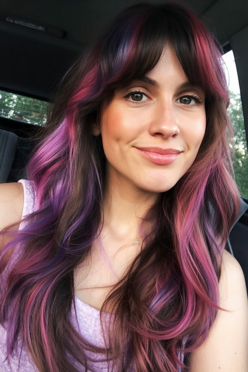 This pink and purple balayage effect with the peekaboo twist has a playful aura about your hair—soft mixed in with punches of bold. Pink tones get gradually deeper as the color approaches the ends, making for a breathtaking gradient that resembles a sunset on your locks. It’s ideal for a person who wishes to experiment with some color without going totally in on any one palette, as not only is the contrast lovely but also whimsical.