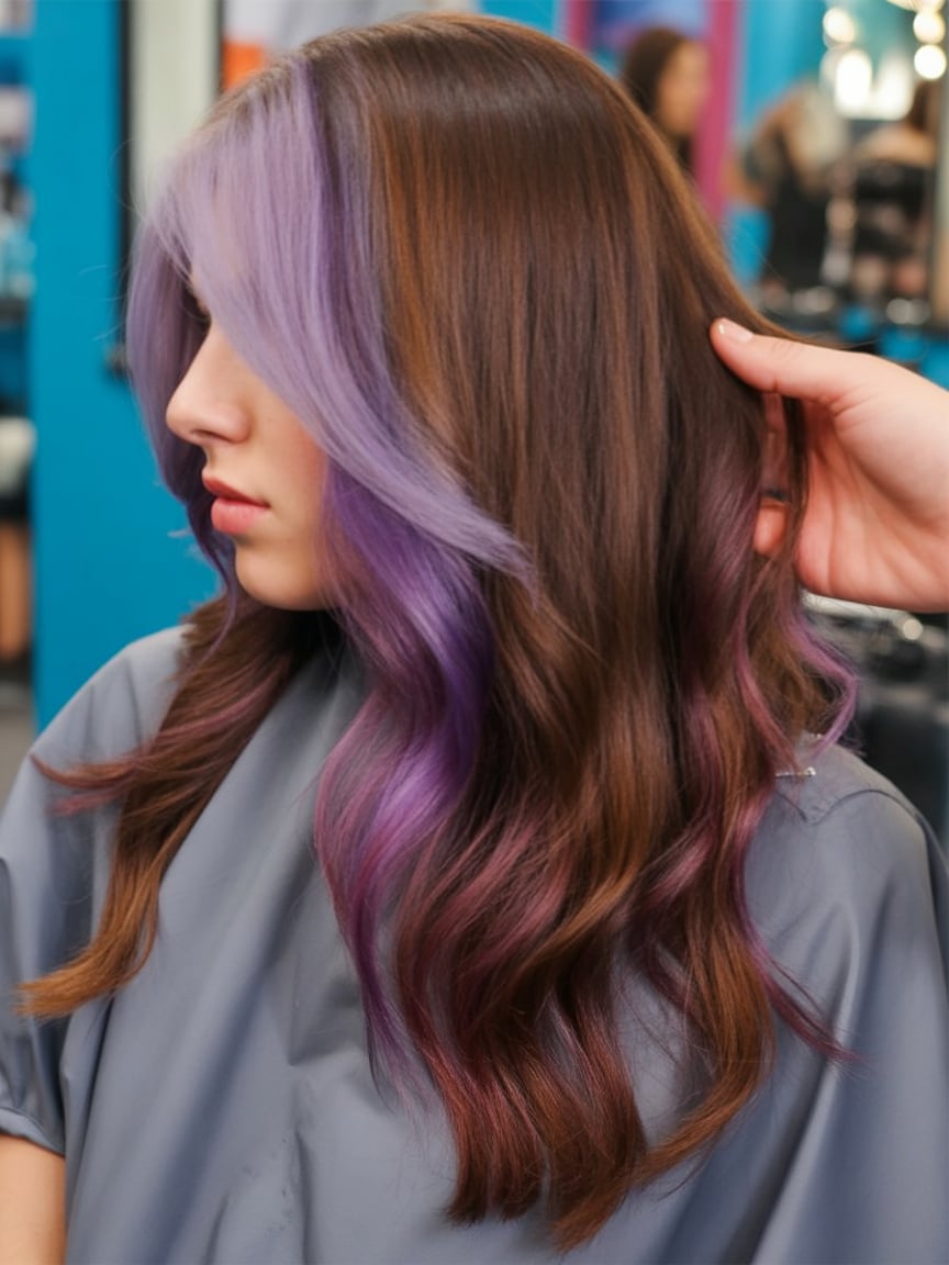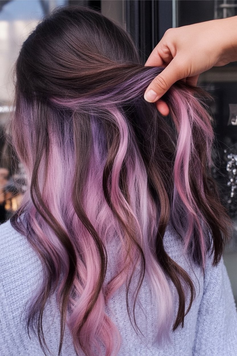 If you’re in the mood for a fresh color but not yet ready to part ways with your dark base, this is one of my absolute favorite brunette underlayer hair color looks. Violet and lilac tones feel modern and a bit mysterious—like a night-out manicure, but for your hair. It’s pretty, yes, but with a “don’t mess with me” polish. And because it’s hidden underneath, you can tailor how dominant it is around your neck from day to day.