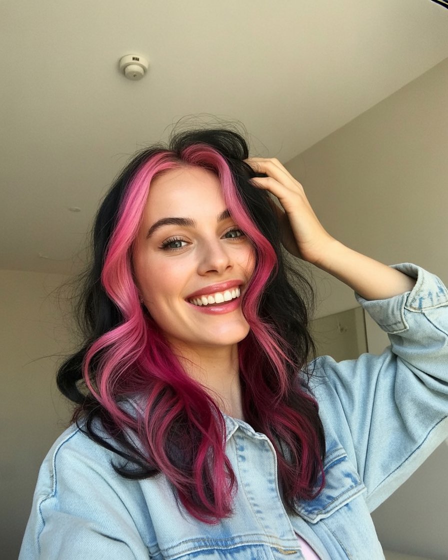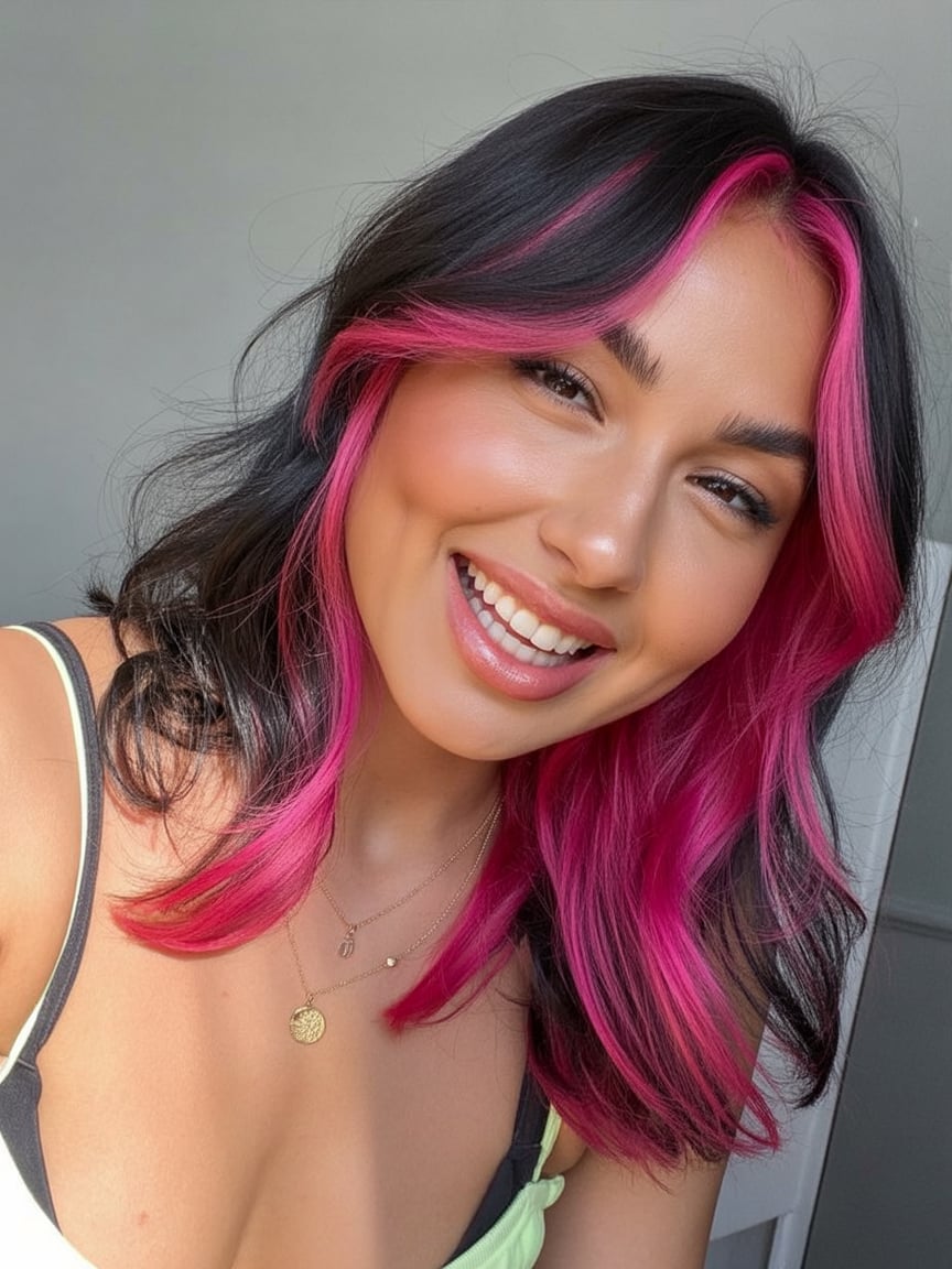 On trend, this chunky face frame stays hot for 2025 and slides straight into peekaboo hair color in 2026 because it photos like a dream and grows out with attitude. Request thicker panels rather than baby highlights so the contrast remains crisp, and leave the rest dark for drama. It works on hair that’s straight, wavy, or curly; diffuse curls for a soft wave so that as you walk around, pink flashes in different places. A heat protectant will help maintain the bright tone of your locks and keep split ends at bay.