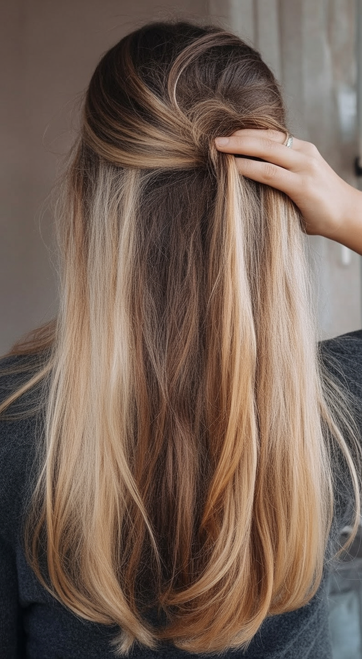 This look is perfect for straight to wavy hair textures and is great if you are someone who adores a simple, no-fuss style that’s still trendy. The softer highlights with half-up, half-down allow for versatility and movement, and the natural finish makes this an ideal option for someone wanting a low-maintenance yet stylish hue. A texturizing spray also adds volume to those baby waves, making the peekaboo effect pop with hardly any effort.