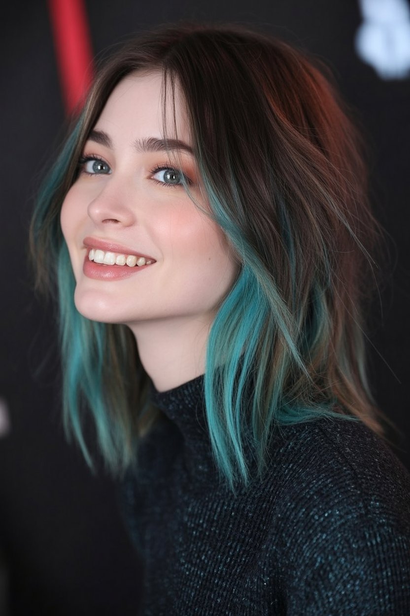 It’s best for this style to be on straight to slightly wavy hair, since that’s where the color can sit nicely and smooth out as you style it for contrast. Teal is one of the colors that you’d like to see on a dark base; this makes this cool look pop without requiring much upkeep. Wash with a sulfate-free shampoo so the teal stays bright, and apply a light leave-in conditioner to prevent the brown base from looking too flat.