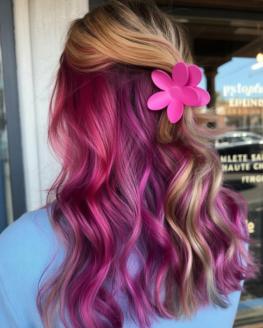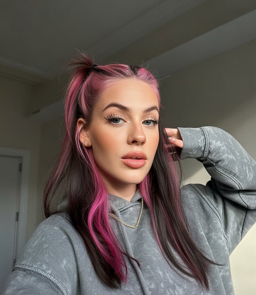 Half-up hair is already a smidge “main character,” and these pink panels take it straight to fun town, without abandoning the seriousness. You get that cute lift at the crown, plus shimmering pieces framing the face and popping through the lengths as if you’re wearing confidence, not just color. It’s young without being juvenile—more “I still have things to do” than “I am attempting to be 22.”