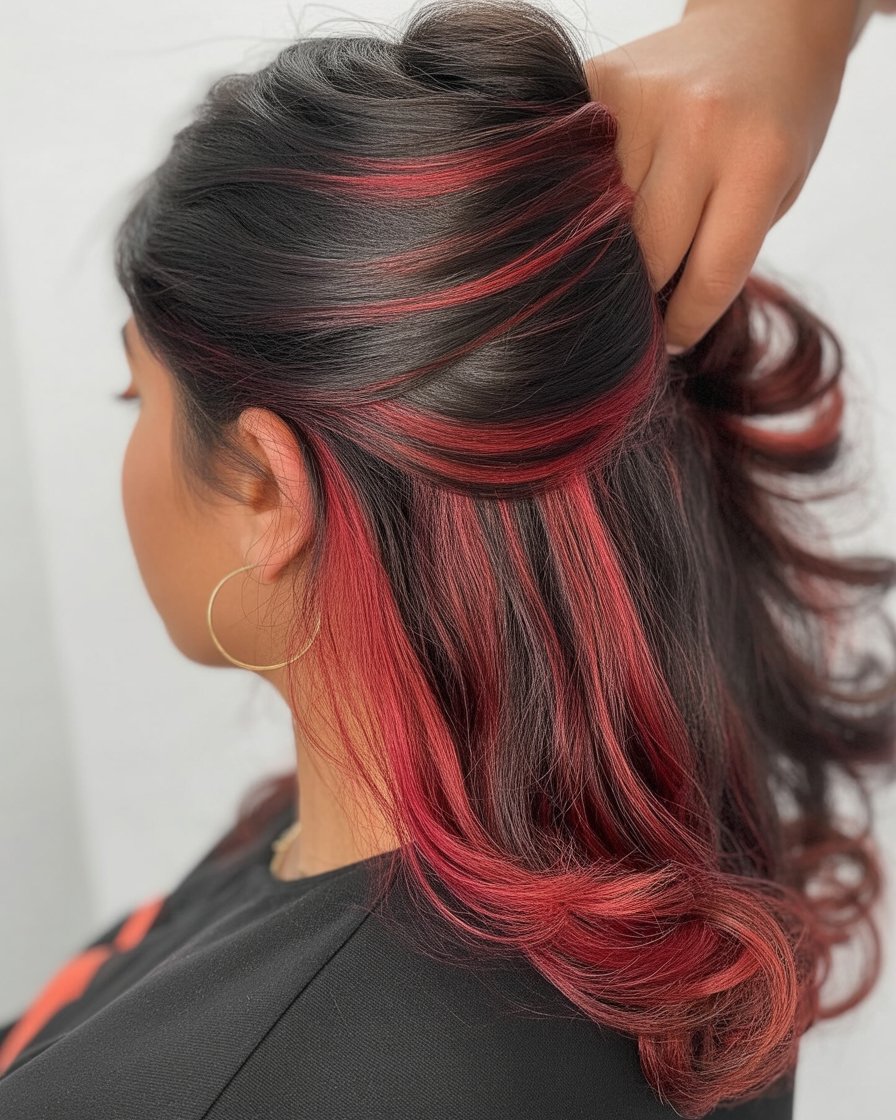 If you’ve been longing for a peekaboo color that delivers a punch, these bold red streaks against a dark base are the perfect statement. The contrast is striking, and the intensity of the red gives your hair an edgy, confident vibe that’s hard to ignore. It’s the perfect choice for someone who isn’t afraid to stand out but still loves the idea of an easy-to-maintain look. The way the red highlights add dimension to your hair makes it feel alive with color and energy.