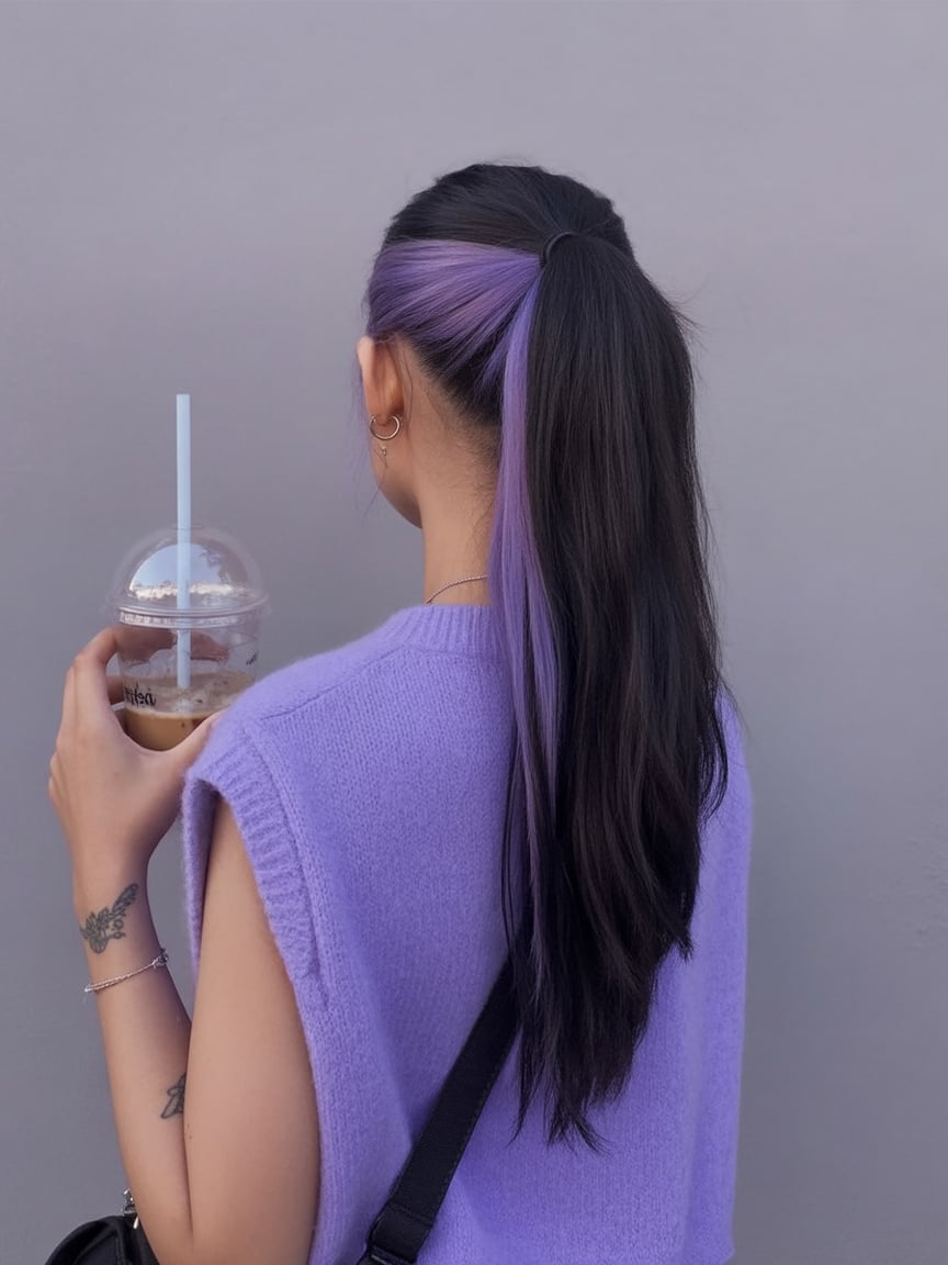 2. Sleek Ponytail with Purple Underlayer Ribbon
