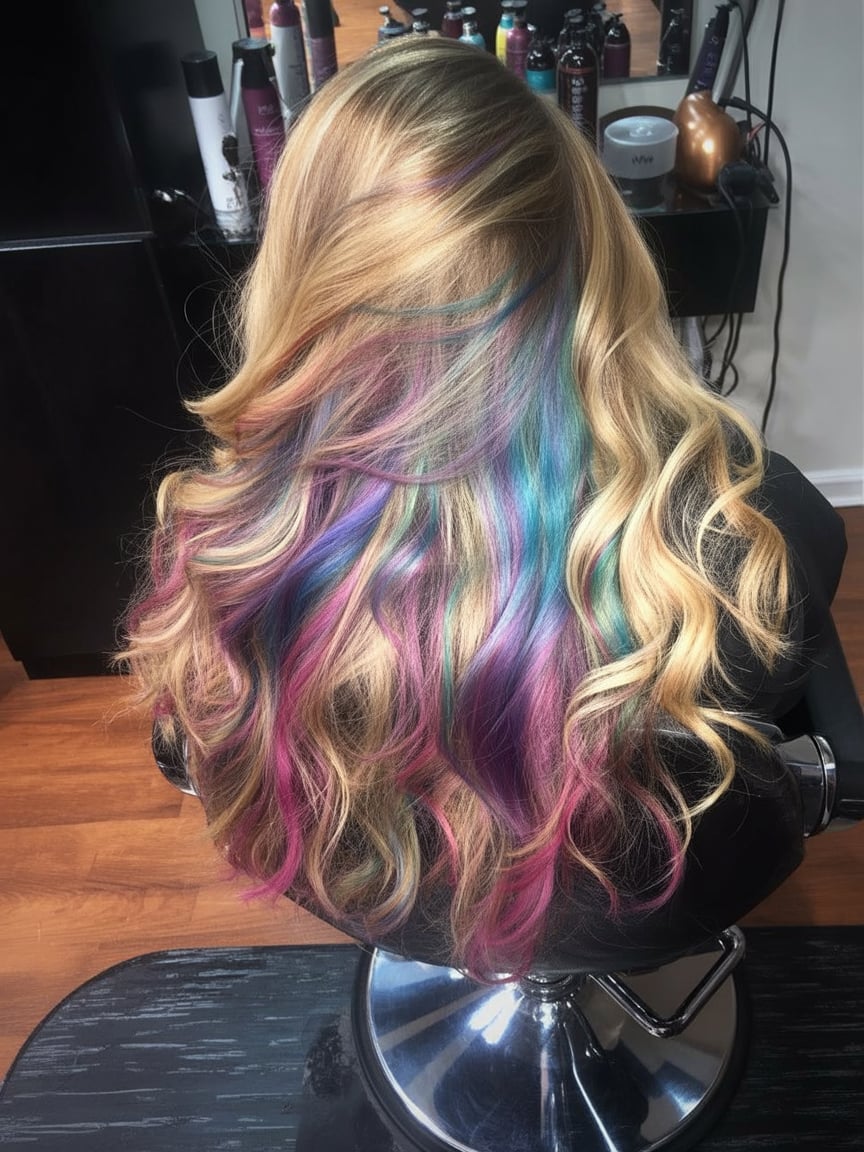 Now this is Peekaboo, Fairy Dream Edition—and in the best way. Topped with a head of blonde and a swirl of iridescent highlights underneath, it moves as if there were its own little prism effect in between the locks. It’s bonkers, artful, and still somehow wearable—as if your pubescent self and the grown-up you finally agreed on something. When you curl it, the colors whisper; when you flip it, they sing.