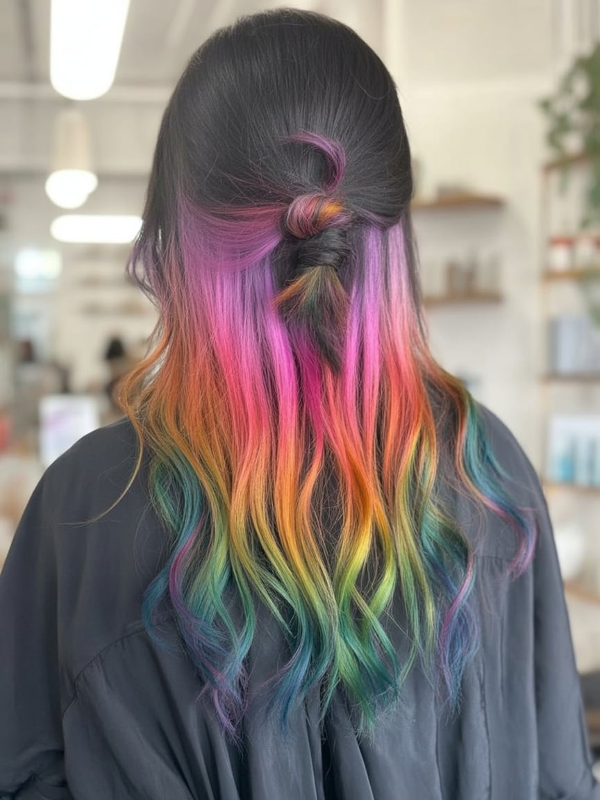 If you’re looking to fully embrace the fun side of hair color, this rainbow peekaboo ends look is absolutely magical. From vibrant pinks to cool blues and greens, these colors pop from the bottom of your hair, creating a vibrant and playful statement. This is the ultimate expression of personality and joy, perfect for the person who wants to make a bold, artistic move without going over the top in a full color.