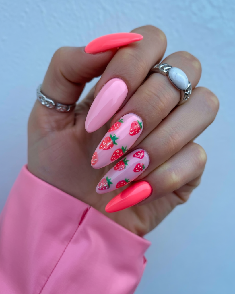 Playful summer style is taken to sweetness with this colorful combination. The set of almond-shaped lip products features neon coral and soft baby pink colors that create vibrant contrasts through artistic design. The most notable aspect is the intricate strawberry decorations that adorn a light pink base that harmoniously blends cute charm and fashionable sass. With its fruity strawberries, the design is one of the most charming and unique artistic creations of 2025. The strawberry design on a pink background is perfect for casual wear and picnics when paired with pastels and floral sundresses.