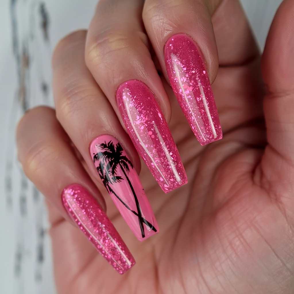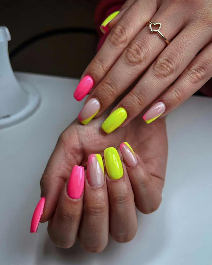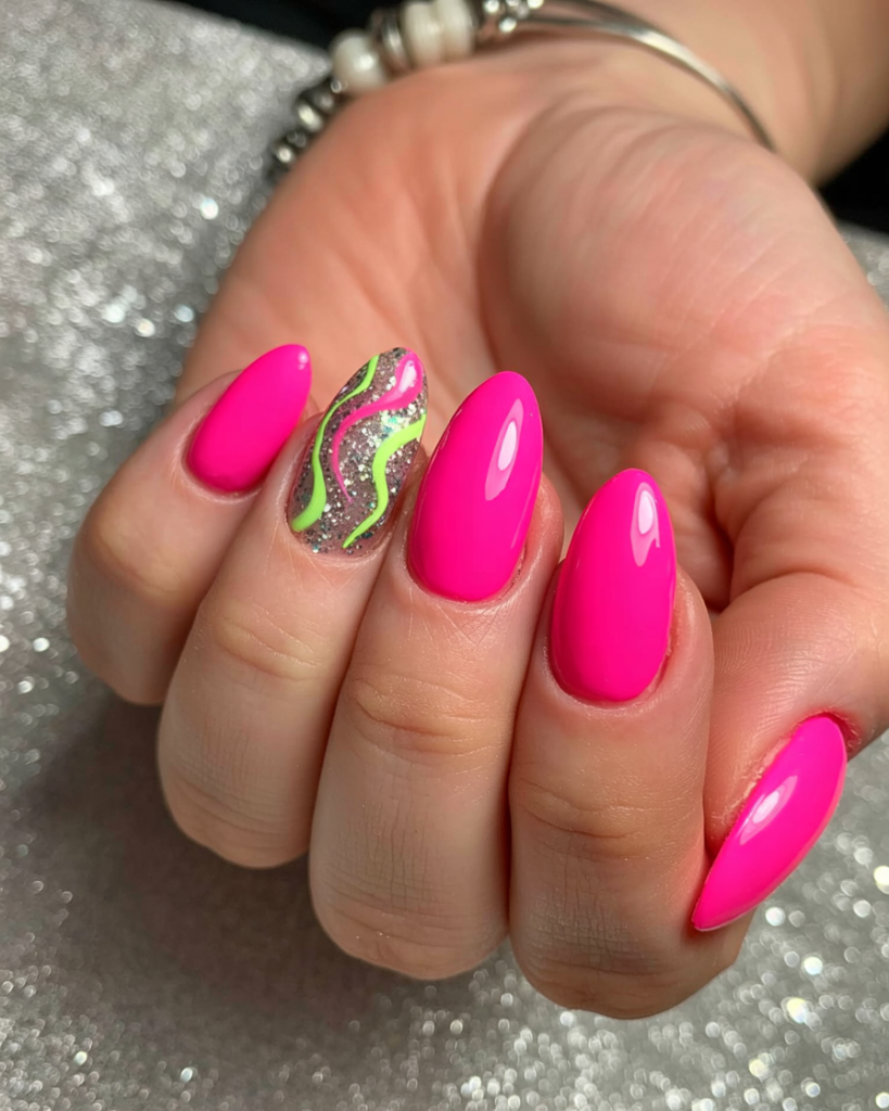 You are about to embark on a spirited journey through pink summer nail fashion for 2025. A surprise on the ring finger uses glitter-infused lime and fuchsia art wavy lines through a bright neon fuchsia polish to create a dazzling effect within an overall glowing set. This statement defines the ultimate party nail, delivering both confidence and trendy urban style. Use this nail look to enhance your all-night dancing or rooftop celebrations at sunset.
