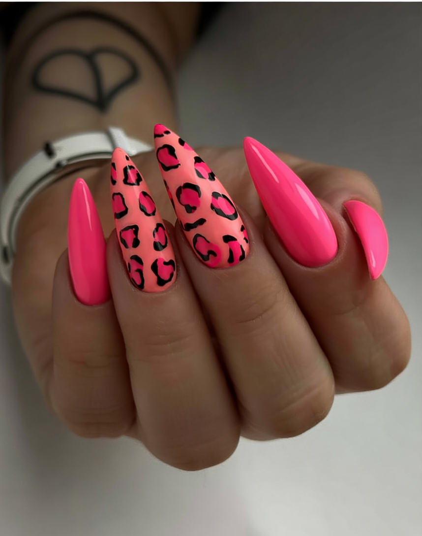 This hot pink leopard design perfectly captures the animal print trend. Thanks to its coffin structure, this rebellious mani offers a sleek, chic design that promises to turn heads. The bold, feminine style nods to 2025 design trends and goes with sophisticated leather outfits as well as casual linen ensembles.
