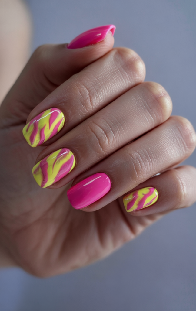 This elegant short nail design with pink and yellow swirls creates a vibrant summer look that cannot be ignored. The abstract striped pattern brings a carefree feeling that works for formal brunches as well as casual beach adventures. People who want sophisticated yet uncomplicated fashion-inspired nails should choose this style, which functions as a top recommendation.